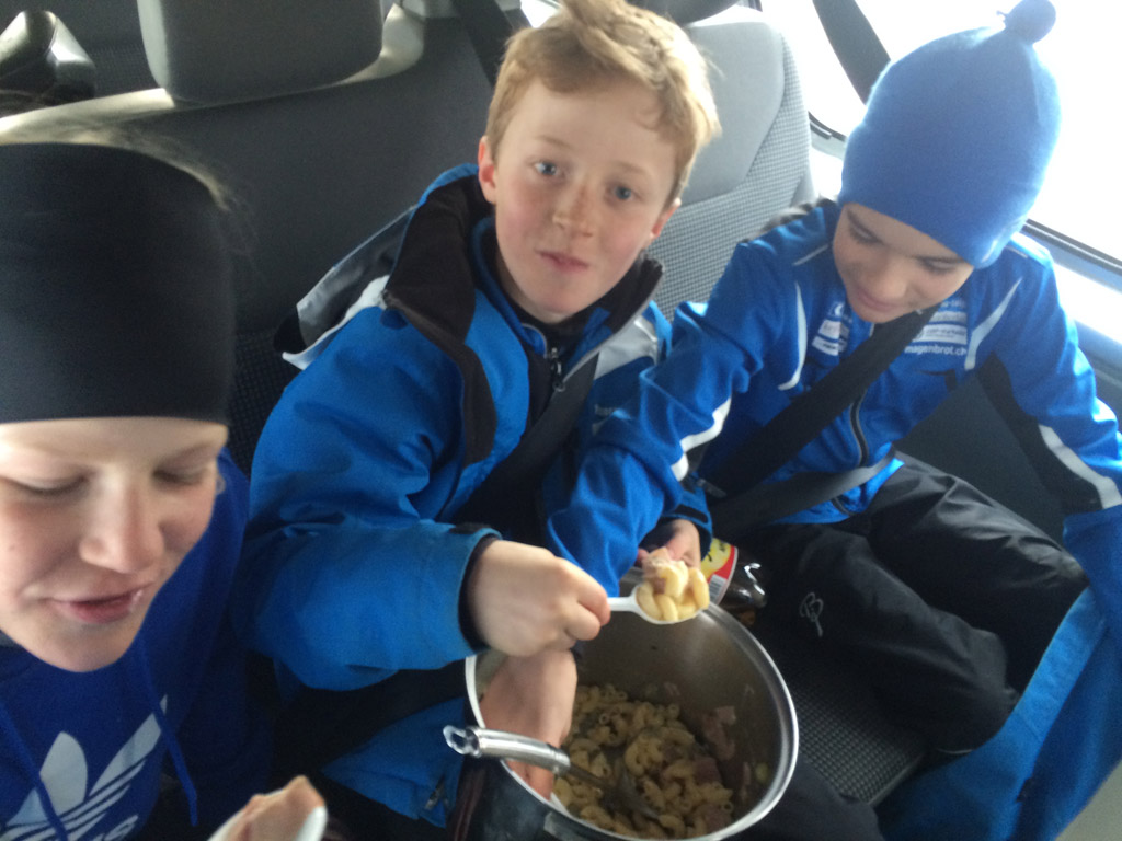 Unser Menuplan: Freitagabend, Lachsbrötli zum Apéro, danach Salat und selbstgemachte Pizza / Samstagmittag, selbstgemachter Hörnlisalat, Gemüse und Obst / Samstagnachmittag, nach dem Wettkampf ist vor dem Wettkampf, Dreikampf um das letzte Hörnli (siehe Bild) / Samstagabend, ein Döner geteilt durch fünf zum Apéro, danach Salat und Spaghetti / Samstag-später-am-Abend, Dreikampf um das letzte Popcorn / Sonntagmorgen, Morgenfooting zur Bäckerei, "cinq croissants und un Zopf" / Sonntagmittag, Resteverwertung und auf der Heimfahrt...na ja, ihr wisst schon...